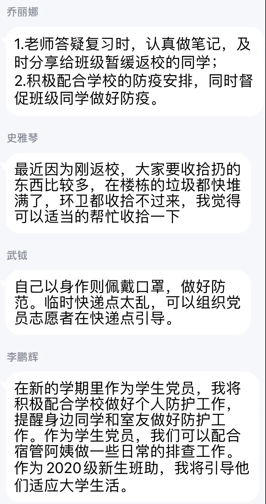 如在疫情期间,党员要以身作则,坚持佩戴口罩,不随意外出,不点外卖;关注那些因为各种原因不能返校的同学,及时向他们传递学习资料以及学校通知;开展卫生清洁活动,在细微处有所作为。对于新生入学,积极为新生解答问题,帮助他们做好返校工作,做好防疫举措,为顺利开学做准备。