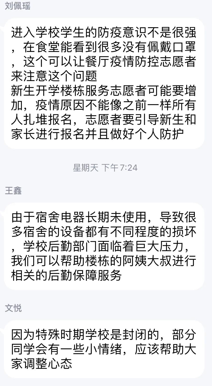 在“以身作则,抗疫不止”主题讨论中,同学们提出了在疫情期间、开学以来、新生入学会面临的很多问题,大家集思广益,对预见的各种问题提出很多解决思路。
